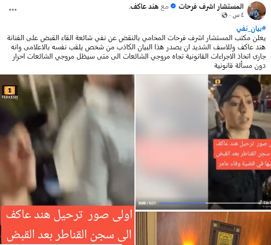 ومن جانبها، أعلنت الفنانة هند عاكف، عن شروعها في اتخاذ الإجراءات القانونية اللازمة ضد مروجي شائعة القبض عليها وترحيلها إلى السجن، وذلك بعد انتشار مقطع فيديو زعم فيه توقيفها برفقة أحد الأشخاص.