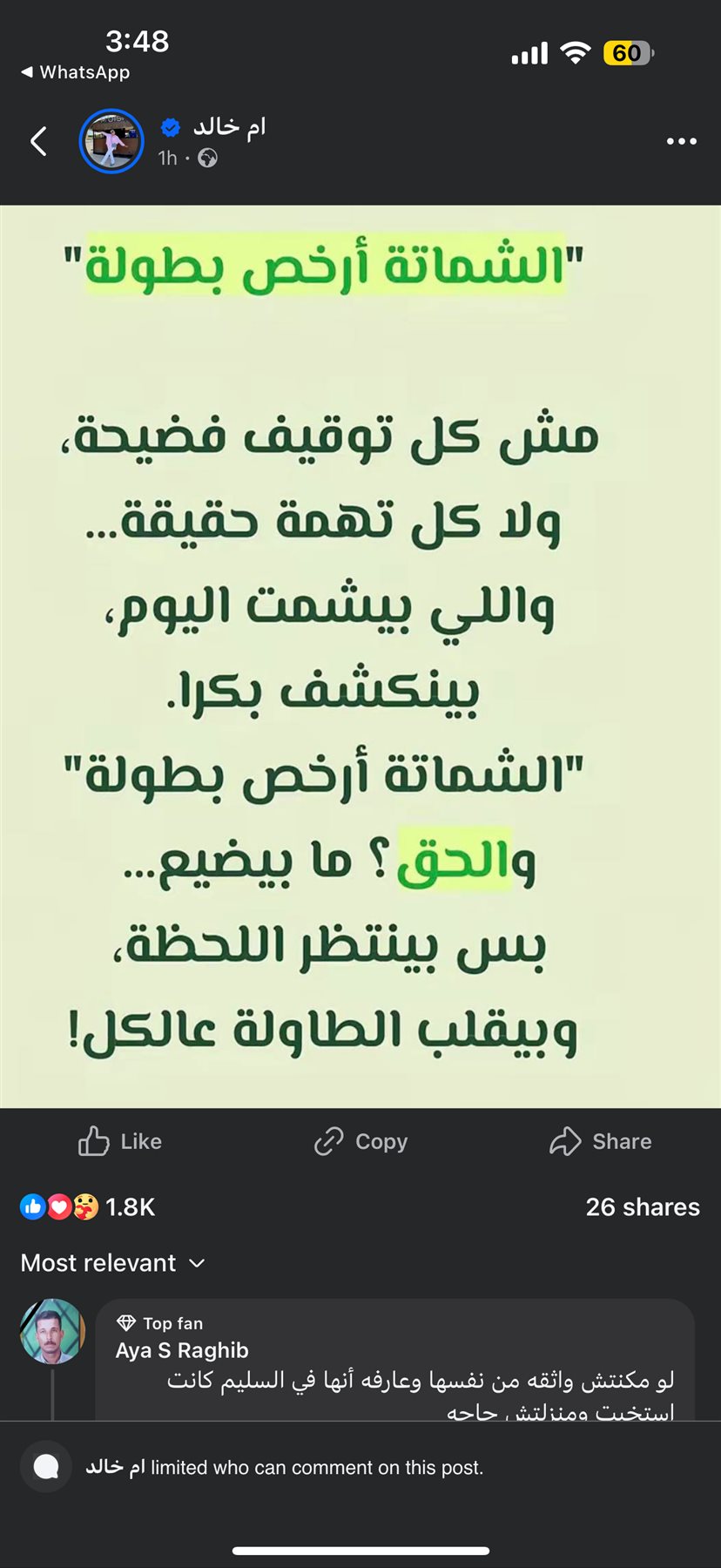 “الشماتة أرخص بطولة والحق ما بيضيع.. بس بينتظر اللحظة وبيقلب الطاولة عالكل”.