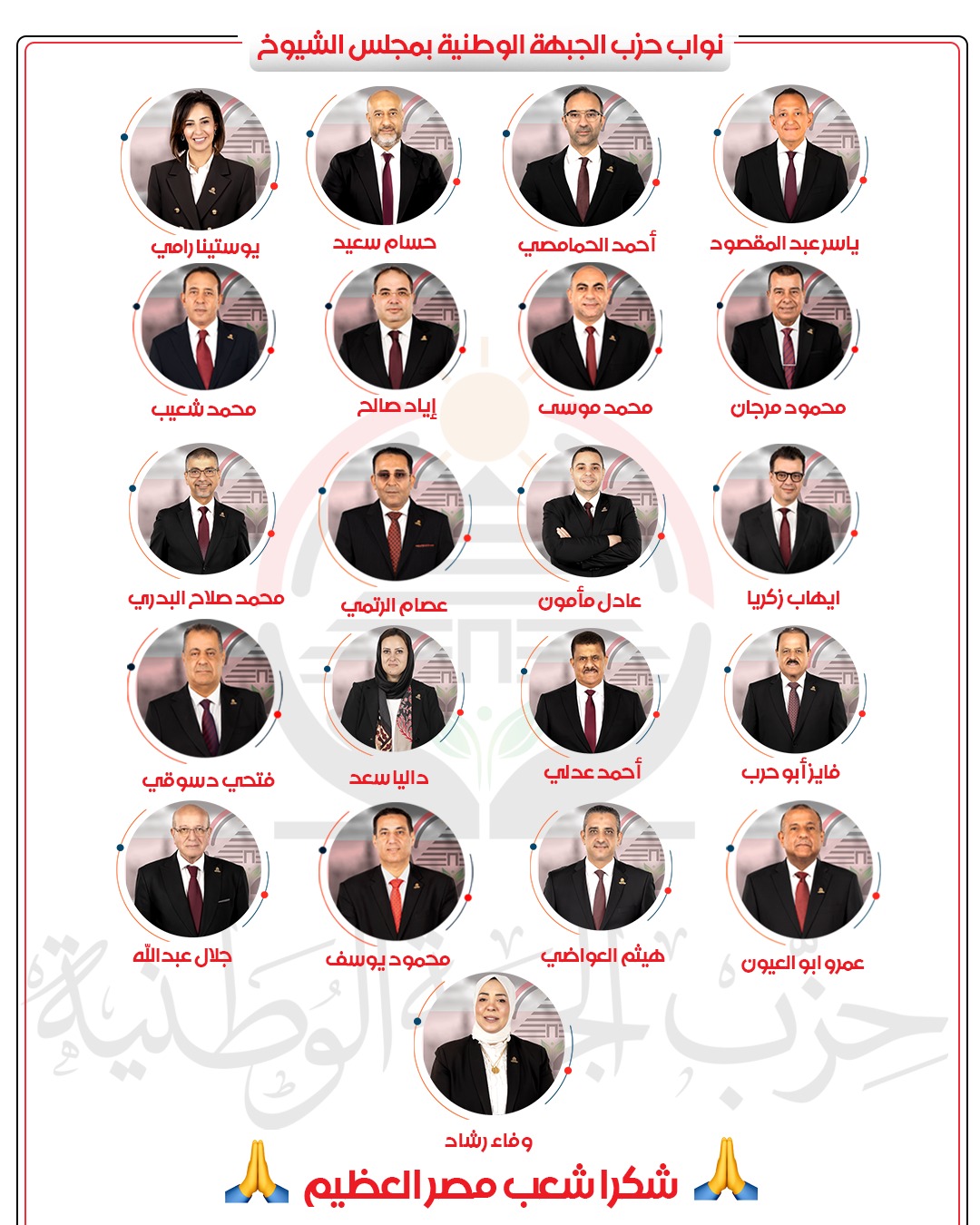 تقدم حزب الجبهة الوطنية بخالص الشكر والتقدير إلى الشعب المصري العظيم على ثقته الغالية التي منحها لمرشحي الحزب في انتخابات مجلس الشيوخ 2025، الذين بلغ عددهم 21 عضوا.