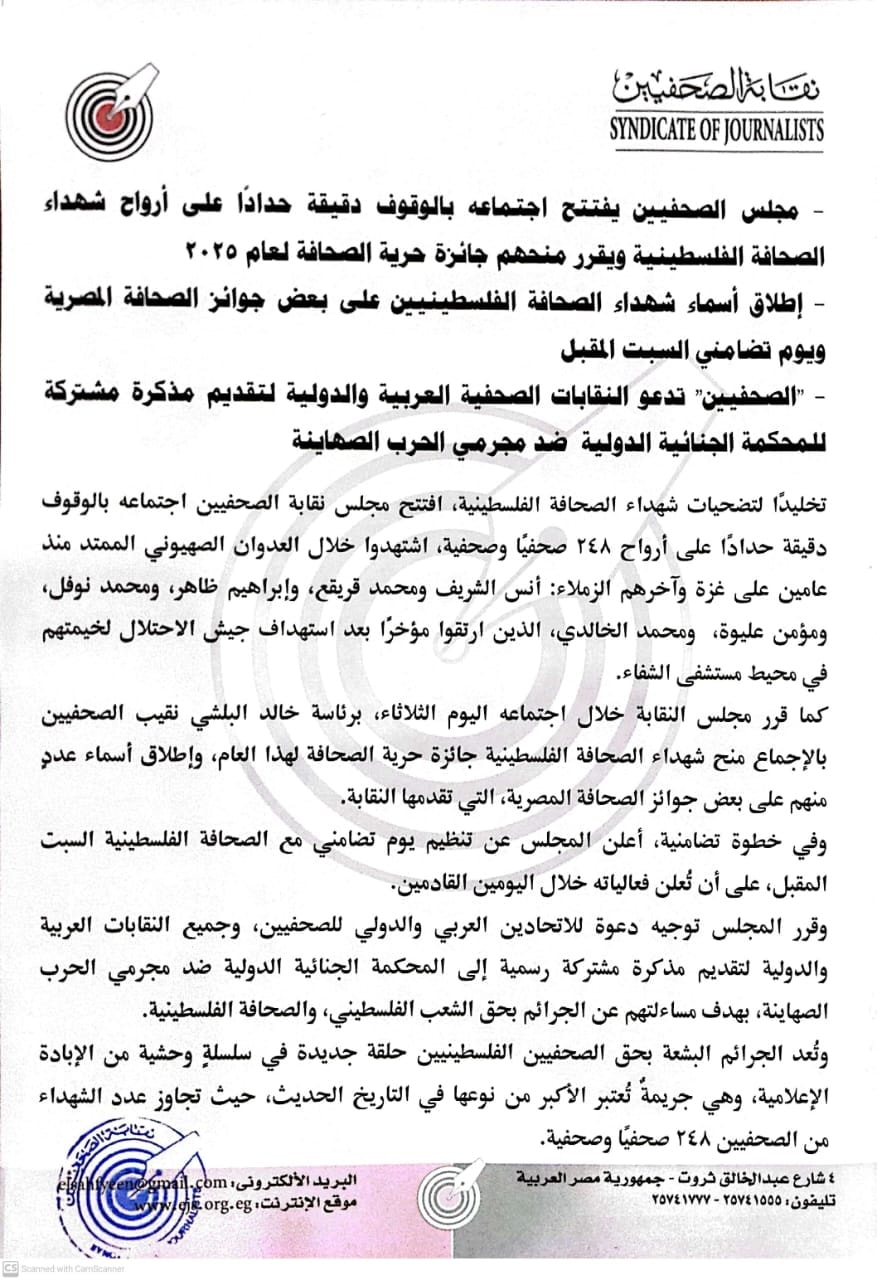 كما قرر مجلس النقابة خلال اجتماعه اليوم الثلاثاء، برئاسة خالد البلشي نقيب الصحفيين بالإجماع منح شهداء الصحافة الفلسطينية جائزة حرية الصحافة لهذا العام، وإطلاق أسماء عددٍ منهم على بعض جوائز الصحافة المصرية، التي تقدمها النقابة.