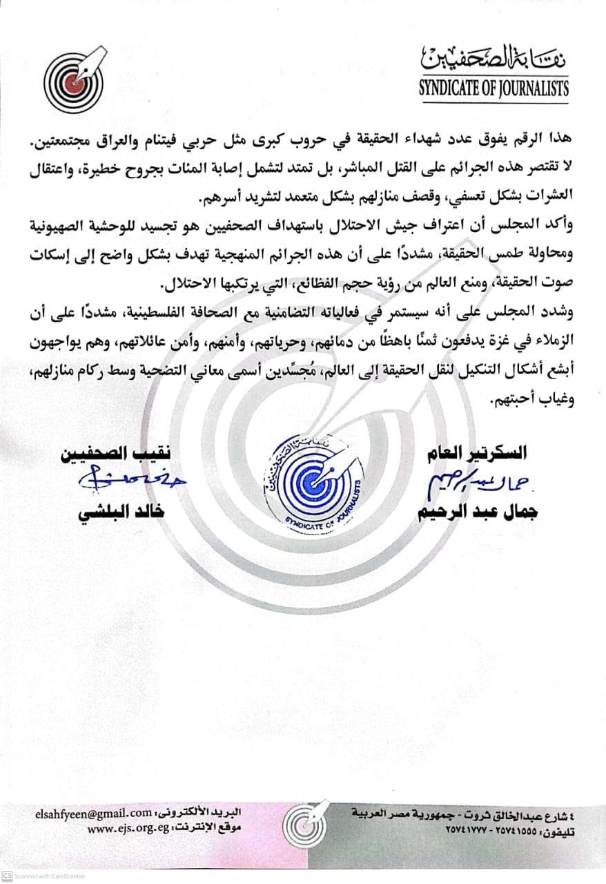وقرر المجلس توجيه دعوة للاتحادين العربي والدولي للصحفيين، وجميع النقابات العربية والدولية لتقديم مذكرة مشتركة رسمية إلى المحكمة الجنائية الدولية ضد مجرمي الحرب الصهاينة، بهدف مساءلتهم عن الجرائم بحق الشعب الفلسطيني، والصحافة الفلسطينية.