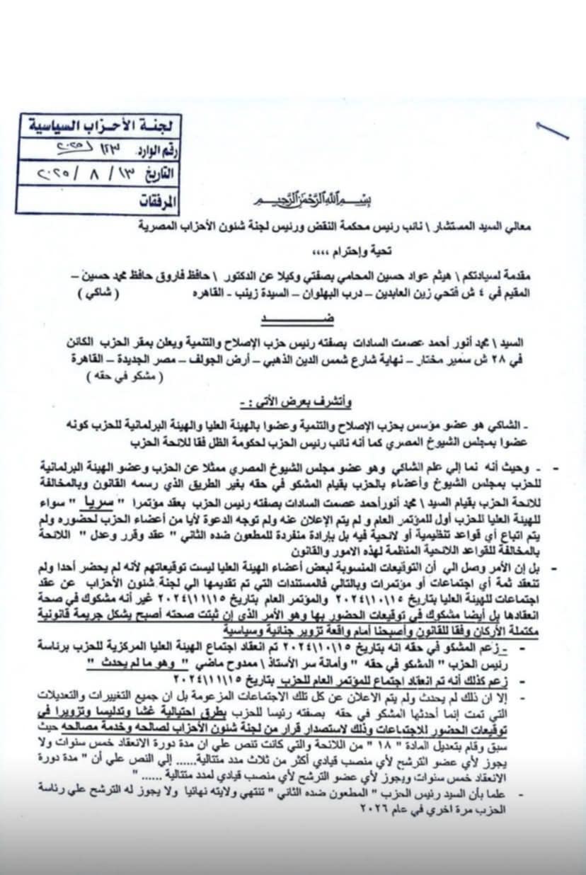 طالب كل من النائب حافظ فاروق، عضو مجلس الشيوخ، ونائب رئيس حزب الإصلاح والتنمية، وأسامة بديع، أمين شباب الحزب، وعضو الهيئة العليا، أعضاء الحزب وأعضاء الهيئة العليا بالتعاون في كشف الحقائق حول مخالفات لائحية وقانونية، وفق بيان صادر عن القياديان في الحزب.