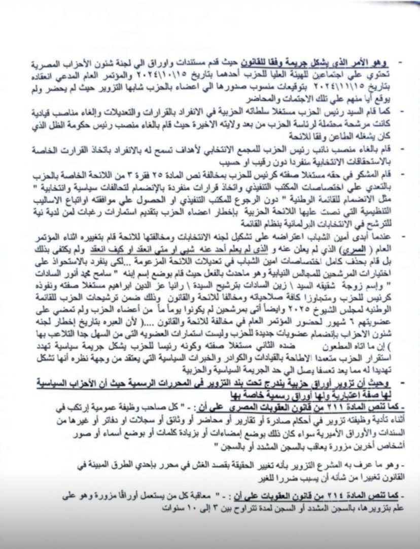 وأكد القياديان، في البيان، أن الحزب عقد اجتماع الهيئة العليا بشكل "سري" ودون دعوة هيئة المكتب في 15 أكتوبر 2024، كما عقد المؤتمر العام بشكل "سري" أيضًا في 15 نوفمبر 2024، مشيرين إلى أن ما جرى تضمن مخالفات لائحية وقانونية تصل إلى أفعال يعاقب عليها القانون، وهي الآن محل تحقيق لدى "الجهات المختصة".