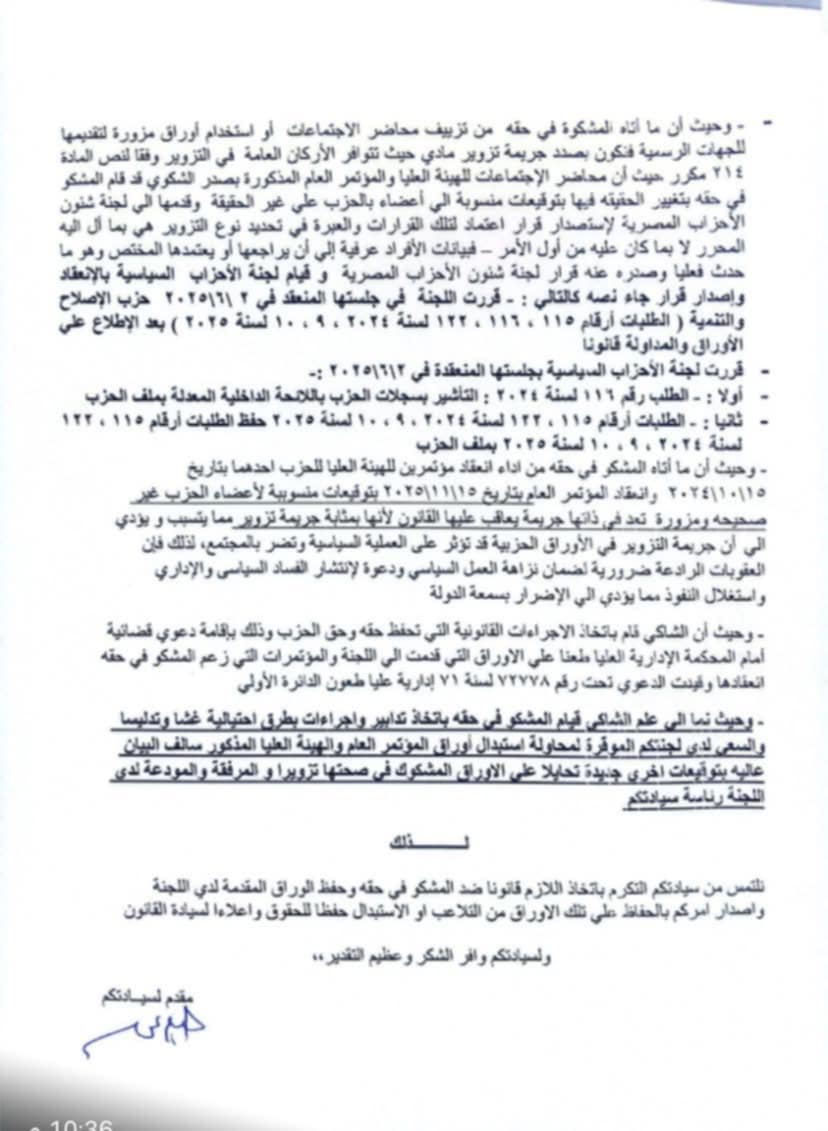 واختتم القياديان بيانهما بالتأكيد على ثقتهما في نزاهة وحيادية لجنة شؤون الأحزاب، وأنها ستتخذ ما يلزم من إجراءات تحفظ حقوق جميع الأطراف، وتكفل سلامة الوثائق، وتمنع أي عبث أو تغيير قد يؤثر على سير التحقيقات، بما يضمن تطبيق القانون واللوائح المنظمة.