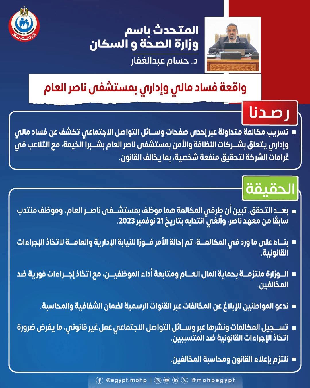 وقال عبالغفار عبر الصفحة الرسمية للمتحدث باسم وزارة الصحة والسكان، إنه تم رصد تسريب مكالمة متداولة عبر إحدى صفحات وسائل التواصل الاجتماعي تكشف عن فساد مالي وإداري يتعلق بشركات النظافة والأمن بمستشفى ناصر العام بشبرا الخيمة، مع التلاعب في غرامات الشركة لتحقيق منفعة شخصية، بما يخالف القانون.