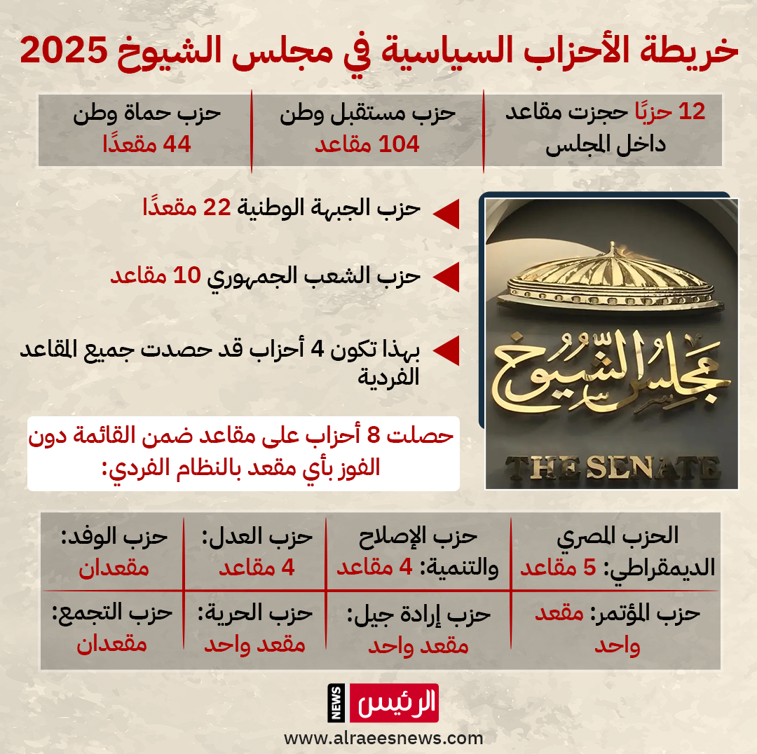 عاجل| خريطة الأحزاب السياسية في مجلس الشيوخ 2025