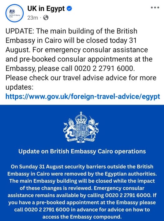 واوضحت السفارة البريطانية بالقاهرة في بيان لها اليوم: «أزالت السلطات المصرية الحواجز الأمنية خارج السفارة البريطانية في القاهرة، سيتم إغلاق مبنى السفارة الرئيسي ريثما تتم مراجعة تأثير هذه التغييرات».