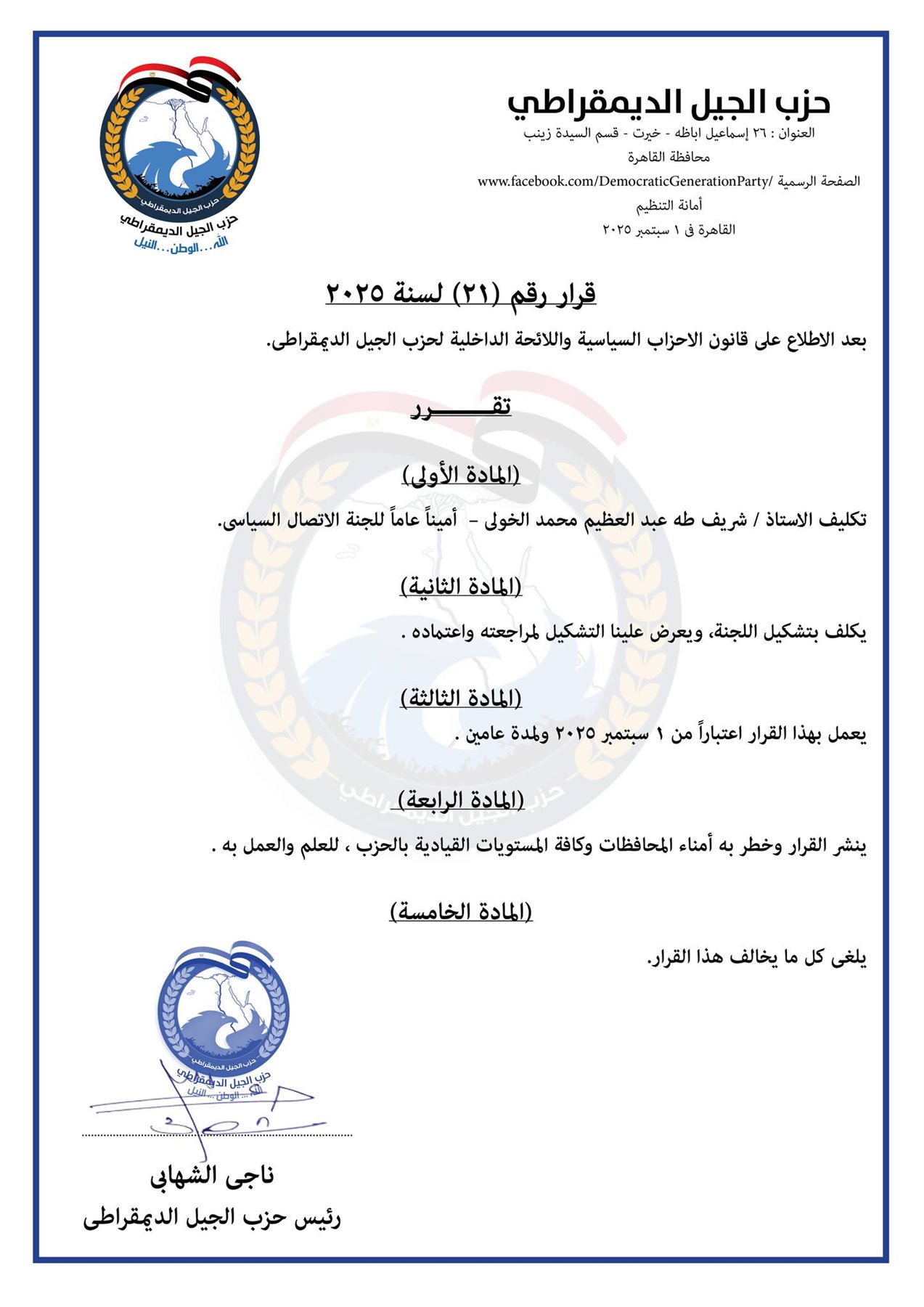أصدر حزب الجيل الديمقراطي قرارًا بتكليف شريف طه عبد العظيم محمد الخولي أمينًا عامًا للجنة الاتصال السياسي، اعتبارًا من 1 سبتمبر 2025 ولمدة عامين.