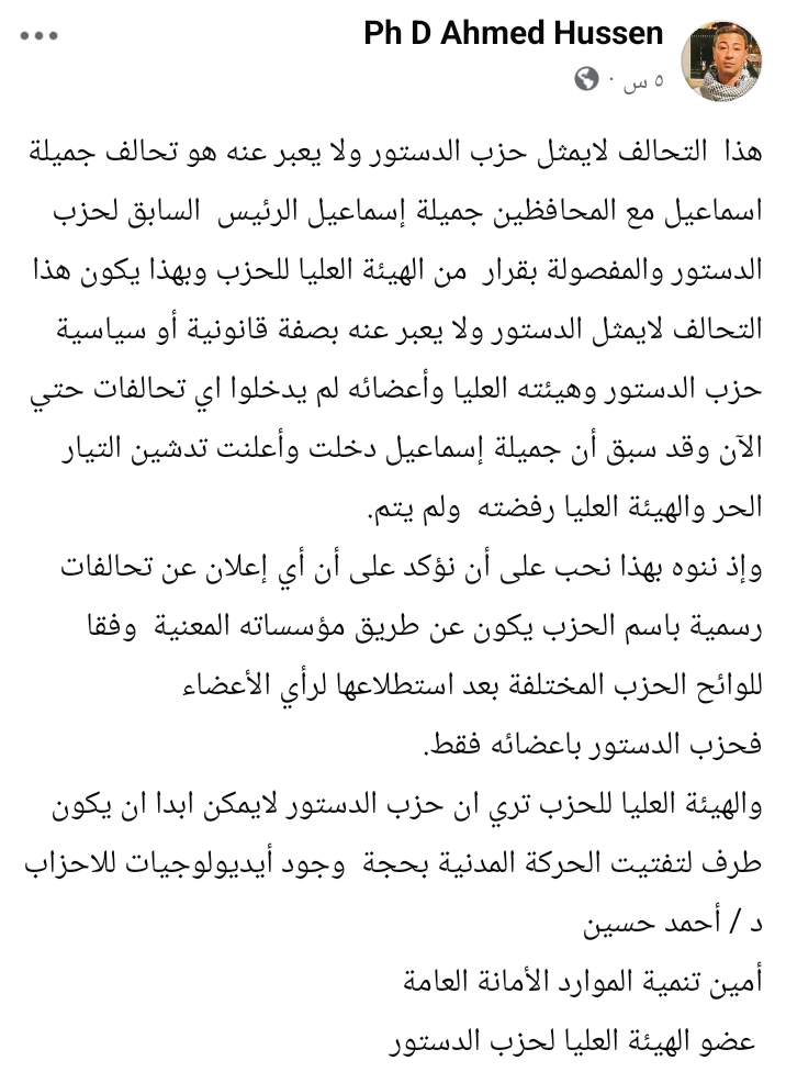 وأكد: إن حزب الدستور الذي تأسس على مبادئ ثورة يناير، وكان مشروع الدكتور محمد البرادعي السياسي، يظل حزبًا مدافعًا عن الحرية والعدالة والديمقراطية. لكن التحركات الأخيرة للسيدة جميلة إسماعيل ألحقت ضررًا بالغًا بصورة الحزب ومكانته.