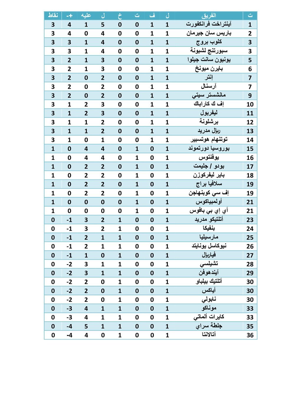 جدول ترتيب دوري أبطال أوروبا قبل الجولة الثانية