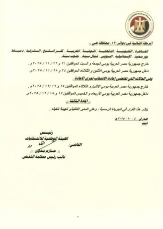 ولفت إلى إعلان نتيجة انتخابات المرحلة الثانية يوم 2 ديسمبر، وتستأنف في نفس الوقت الدعاية الانتخابية لجولة الإعادة، ويكون الطعن على قرار الهيئة بإعلان النتيجة خلال 48 ساعة من تاريخ الإعلان بحد أقصى يوم 4 ديسمبر، وتفصل المحكمة الإدارية العليا فيما يقدم لها من طعون خلال 10 أيام اعتبارًا من 5 ديسمبر إلى 14 من ديسمبر، وهو يوم بداية الصمت الدعائي لجولة الإعادة.