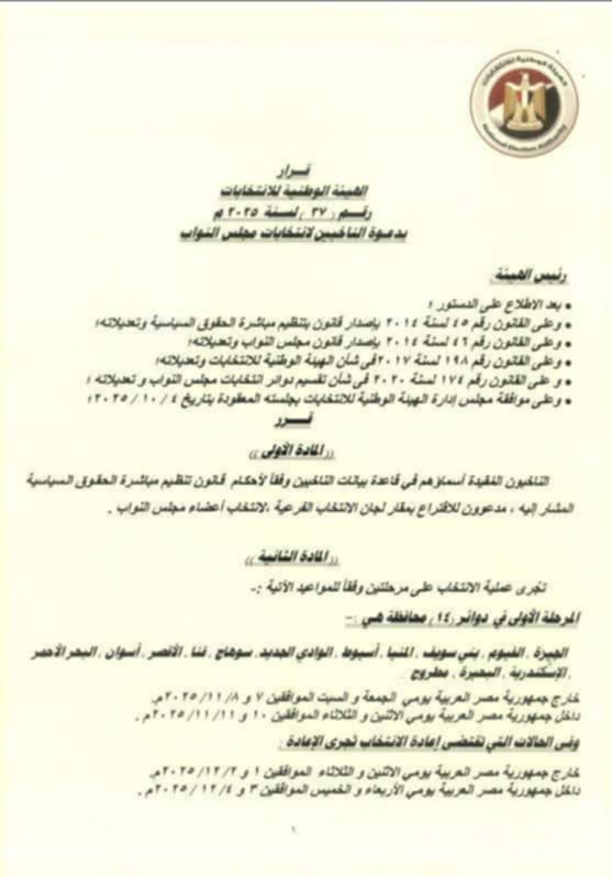 التصويت يبدأ 7 نوفمبر.. الجدول الزمني لانتخابات مجلس النواب 2025