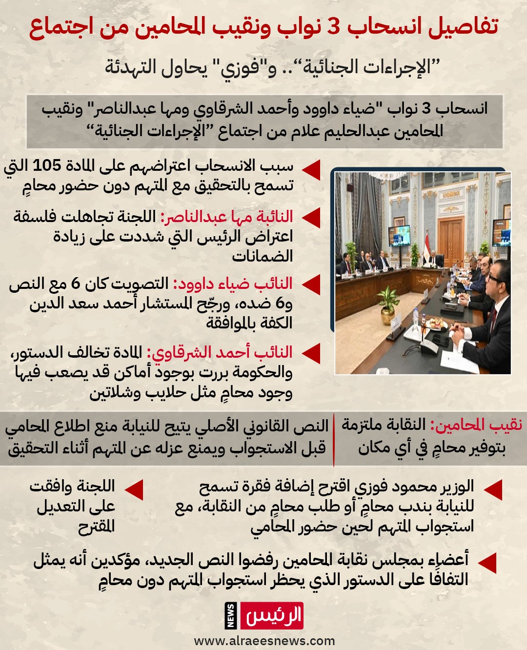 أعلن 3 نواب من أعضاء اللجنة الخاصة لدراسة اعتراض رئيس الجمهورية على قانون الإجراءات الجنائية انسحابهم، خلال اجتماعها اليوم السبت، وهم ضياء داوود وأحمد الشرقاوي ومها عبدالناصر، بالإضافة إلى نقيب المحامين عبدالحليم علام.
