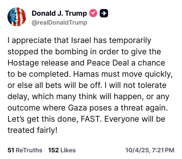 وأضاف: "يجب على حماس التحرك بسرعة، وإلا فإن كل الاحتمالات ستتبدد. لن أتسامح مع أي تأخير - وهو ما يعتقده كثيرون أنه سيحدث - أو مع أي نتيجة تشكل فيها غزة تهديدا مرة أخرى. لِنُنجز هذا العمل بسرعة. سيتم التعامل مع الجميع بعدالة!".