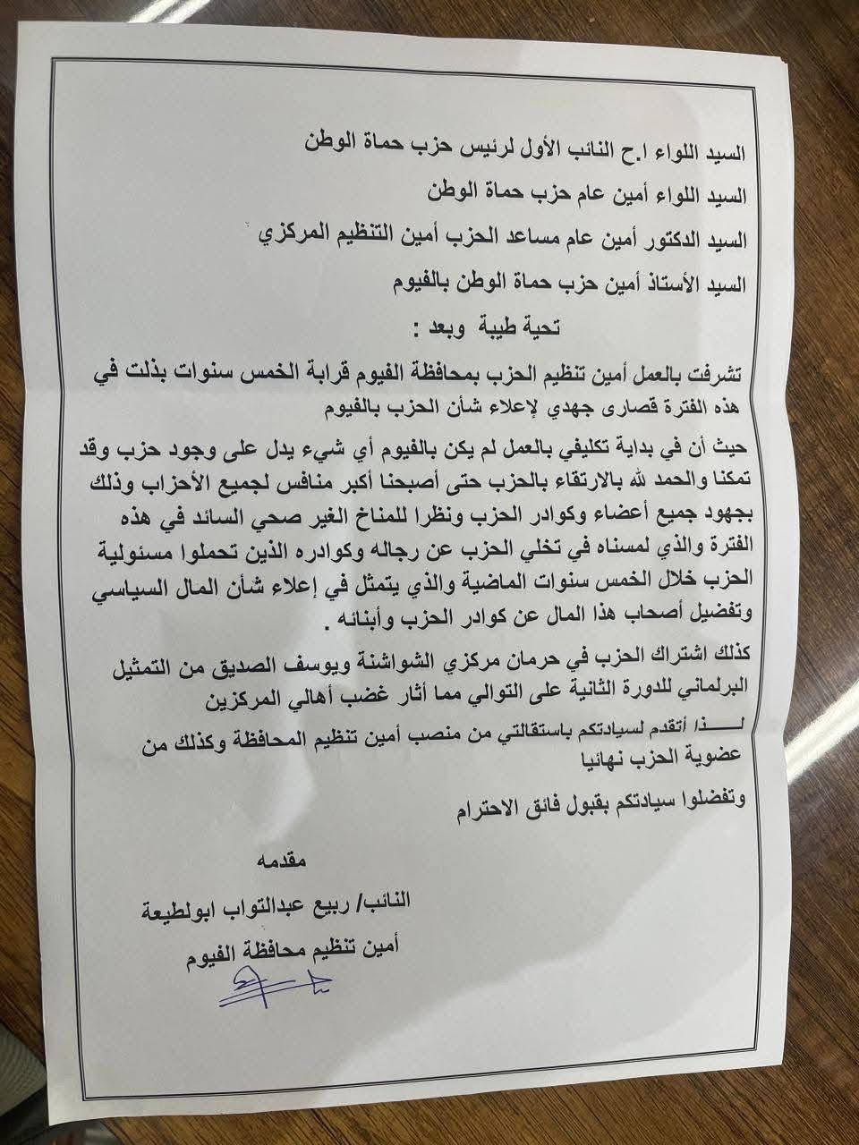 تقدم النائب ربيع عبدالتواب أبو الطبيعة، أمين تنظيم حزب حماة الوطن بمحافظة الفيوم، باستقالته من منصبه ومن عضوية الحزب نهائيًا، بعد نحو خمس سنوات من العمل التنظيمي، مؤكدًا أن قراره جاء احتجاجًا على ما وصفه بـ"هيمنة المال السياسي وتهميش كوادر الحزب".