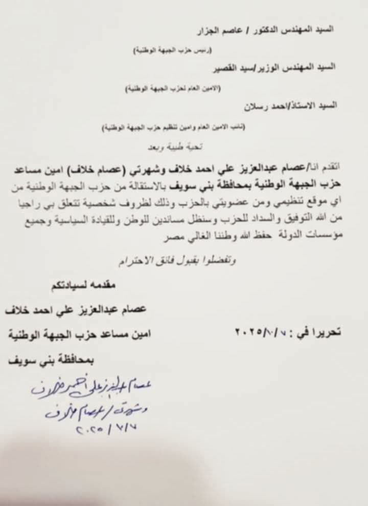 وأضاف البيان: “أسسنا أمانة قوية بفضل الله، وبدعم اللواء عصام خلاف، وكانت الأولى على مستوى المحافظة من حيث النظام والالتزام والتنظيم الجماهيري، وذلك بشهادة الجميع. وقد أثبتنا كفاءتنا خلال أول استحقاق دستوري للحزب في انتخابات مجلس الشيوخ 2025، واليوم نعلن استقالتنا تضامنًا مع اللواء عصام خلاف، ورفضًا لتجاهل أمانة المحافظة وتعنتها المستمر تجاه أمانة مركز الواسطى”.