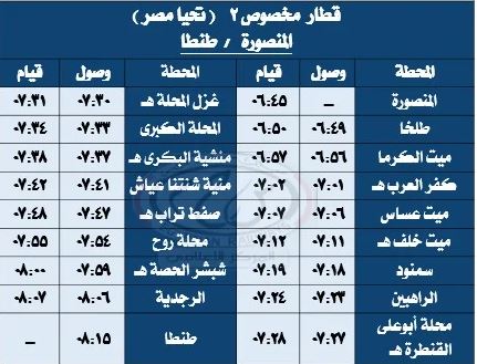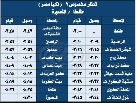 وكذلك تشغيل مخصوص رقم ( 2 ) من طنطا إلى المنصورة حيث يقوم من طنطا الساعة 03:00 ويصل المنصورة الساعة 04:30، على أن يعود من المنصورة الساعة 06:45 ويصل طنطا الساعة 08:15 طبقًا للجداول المرفقة.