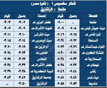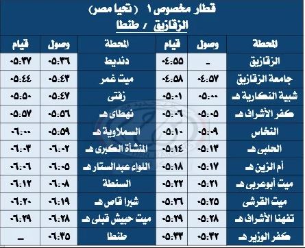 وتقرر تشغيل مخصوص رقم ( 1 ) من طنطا إلى الزقازيق حيث يقوم من طنطا الساعة 02:00 ويصل الزقازيق الساعة 03:50، على أن يعود من الزقازيق الساعة 04:55 ويصل طنطا الساعة 06:35 طبقًا للجداول المرفقة.