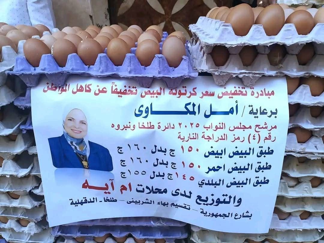 المرشحة التي أعلنت المبادرة عبر لافتة دعائية تحمل صورتها ورمزها الانتخابي (الدراجة النارية)، عرضت من خلالها بيع كرتونة البيض بأسعار مخفضة تراوحت بين 150 و155 جنيهًا للطبق الواحد، مؤكدة أن الخطوة تأتي في إطار دعم المواطنين وتخفيف الأعباء عنهم.