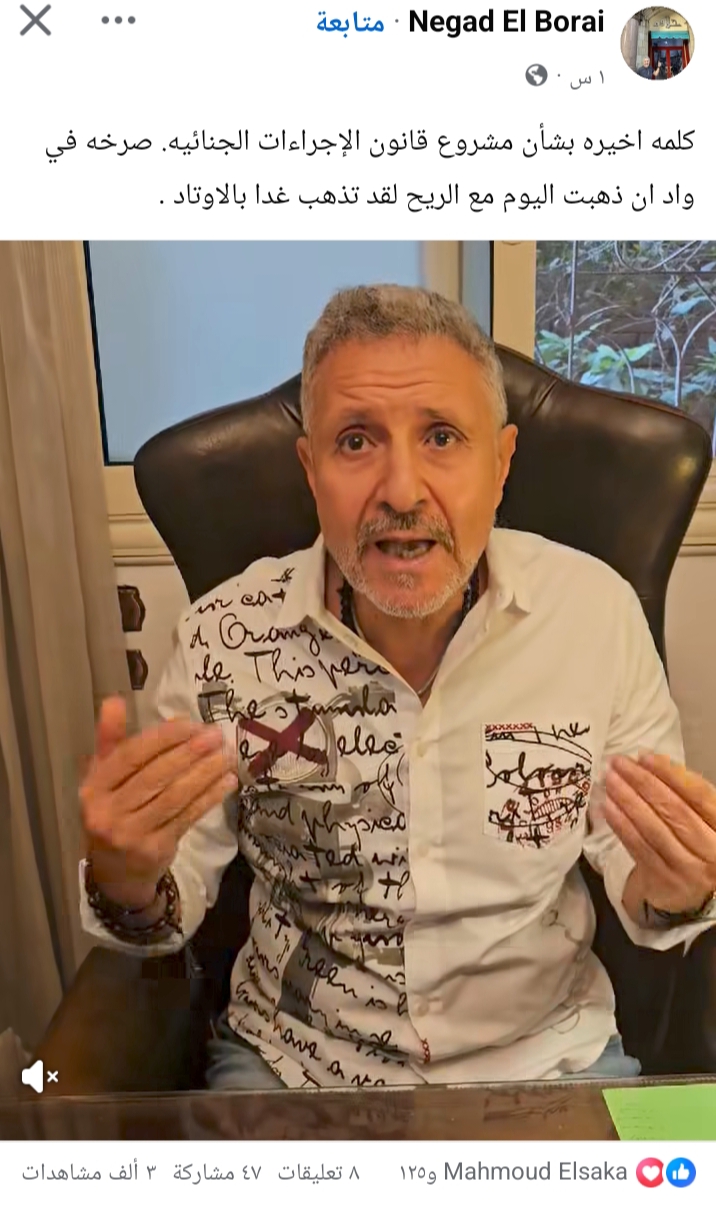 قال المحامي بالنقض وعضو مجلس أمناء الحوار الوطني نجاد البرعي إن مشروع قانون الإجراءات الجنائية يتضمن عددًا من المواد التي تتناقص مع نصوص الدستور، لا سيما المواد (53) و(94) و(96) و(97) و(99)، إذ تمنع المجني عليه في جرائم التعذيب أو انتهاكات حقوق الإنسان من إقامة الدعوى مباشرة أمام المحكمة ضد منتهكي القانون، وتُقصر ذلك على المحامي العام أو النائب العام.