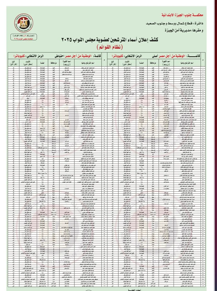 أسماء المرشحين على القائمة الوطنية بشمال ووسط وجنوب الصعيد