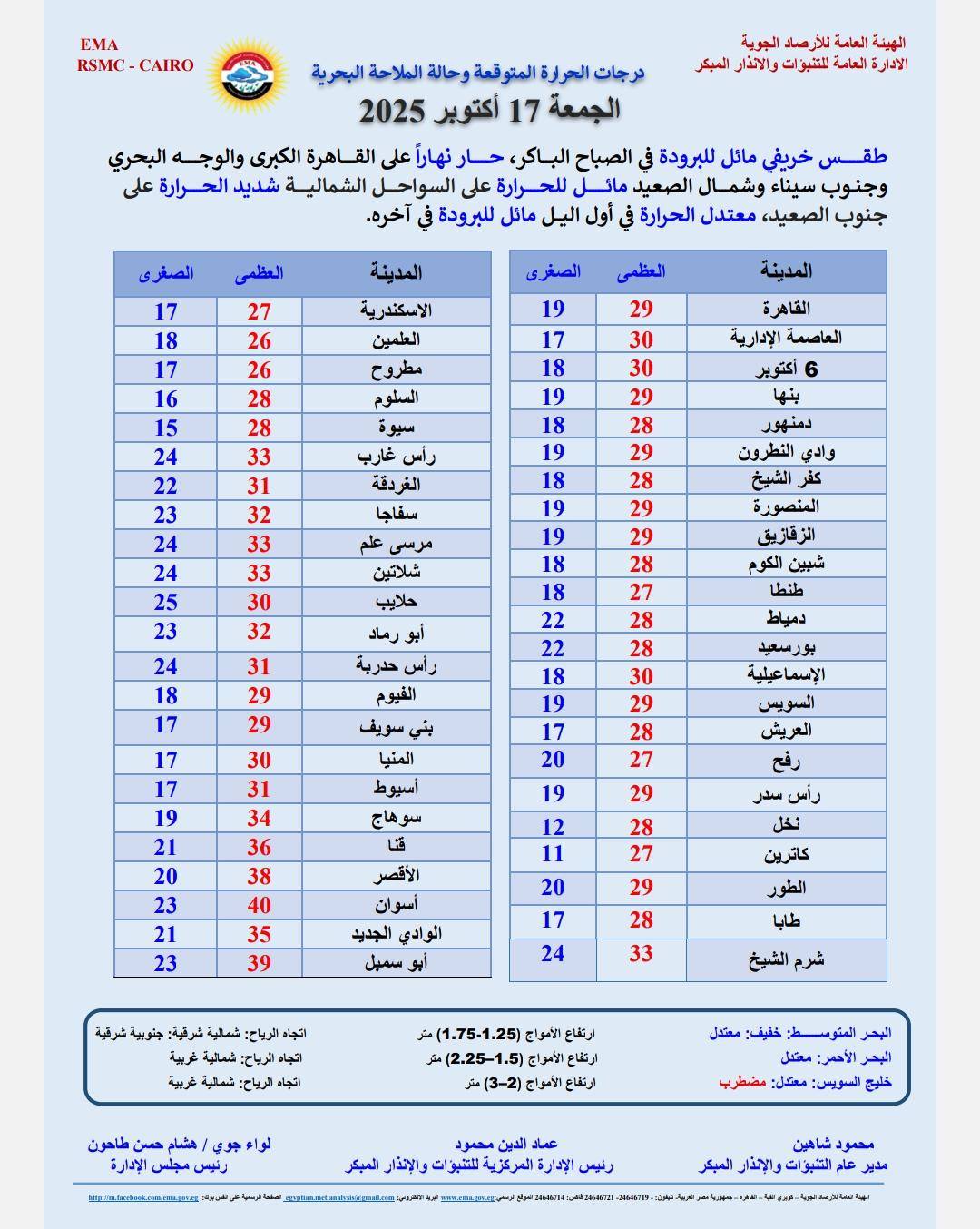 وأوضحت هيئة الأرصاد درجات الحرارة العظمى والصغرى المتوقعة، اليوم، على النحو التالي: