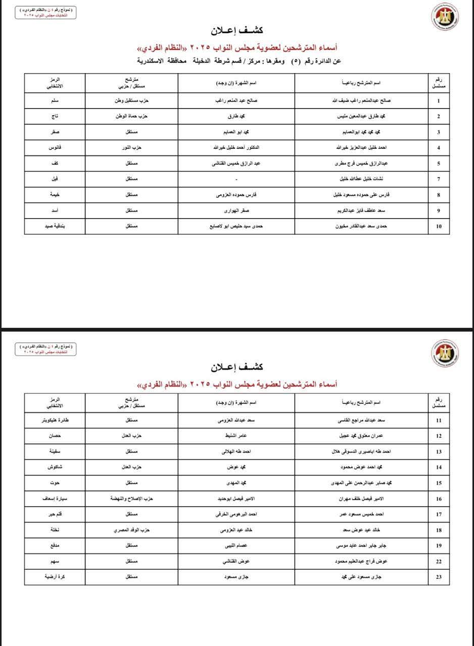 إعلان أسماء مرشحي النظام الفردى لانتخابات النواب 2025 محافظتي بورسعيد والإسكندرية