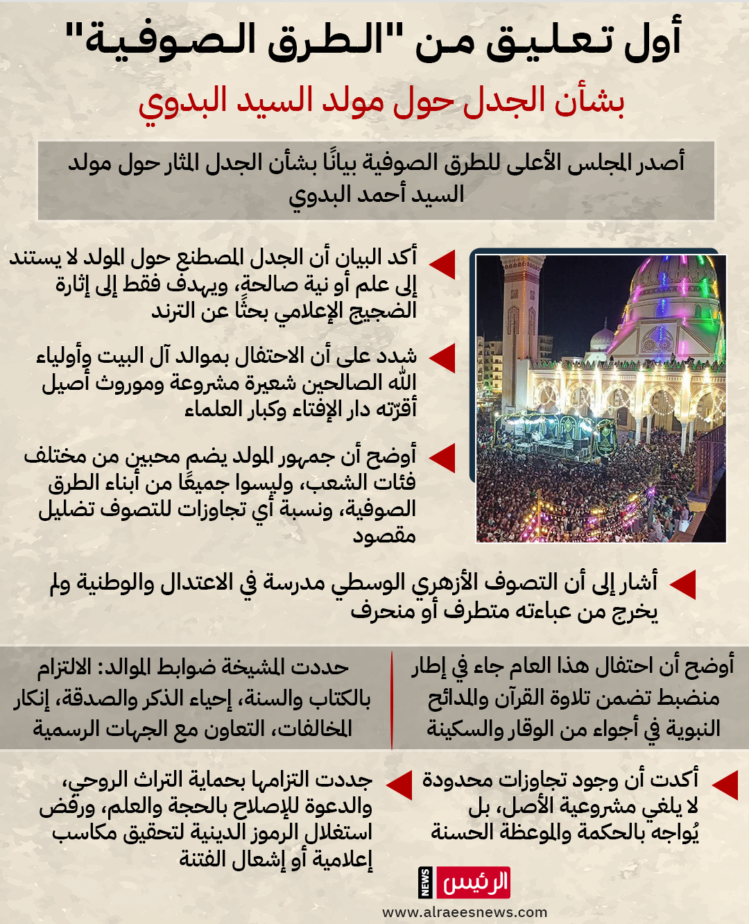 وأكدت المشيخة العامة للطرق الصوفية، أن الجدل المثار حول مولد السيد أحمد البدوي رضي الله عنه جدلٌ مصطنع ومفتعل لا يستند إلى واقعٍ أو علمٍ أو نيةٍ صالحة، بل هو محاولة متكررة لافتعال ضجيج إعلامي بحثًا عن الترند وزيادة المشاهدات على حساب الثوابت الدينية والتراث الروحي للمجتمع المصري، الذي ظلّ عبر قرونه وفي جميع طبقاته يكنّ للسيد البدوي وأضرابه من أولياء الله الصالحين المحبة والاحترام.