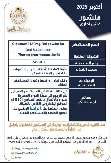 وذكرت في منشورها رقم 74 لسنة 2025، أن التشغيلة "2410102" من دواء "Clavimox 642.9mg/5ml powder for Oral Suspension" غير صالحة للاستخدام، مرجعة ذلك لإفادة الشركة حول وجود عبوات مقلدة من الصنف المذكور.