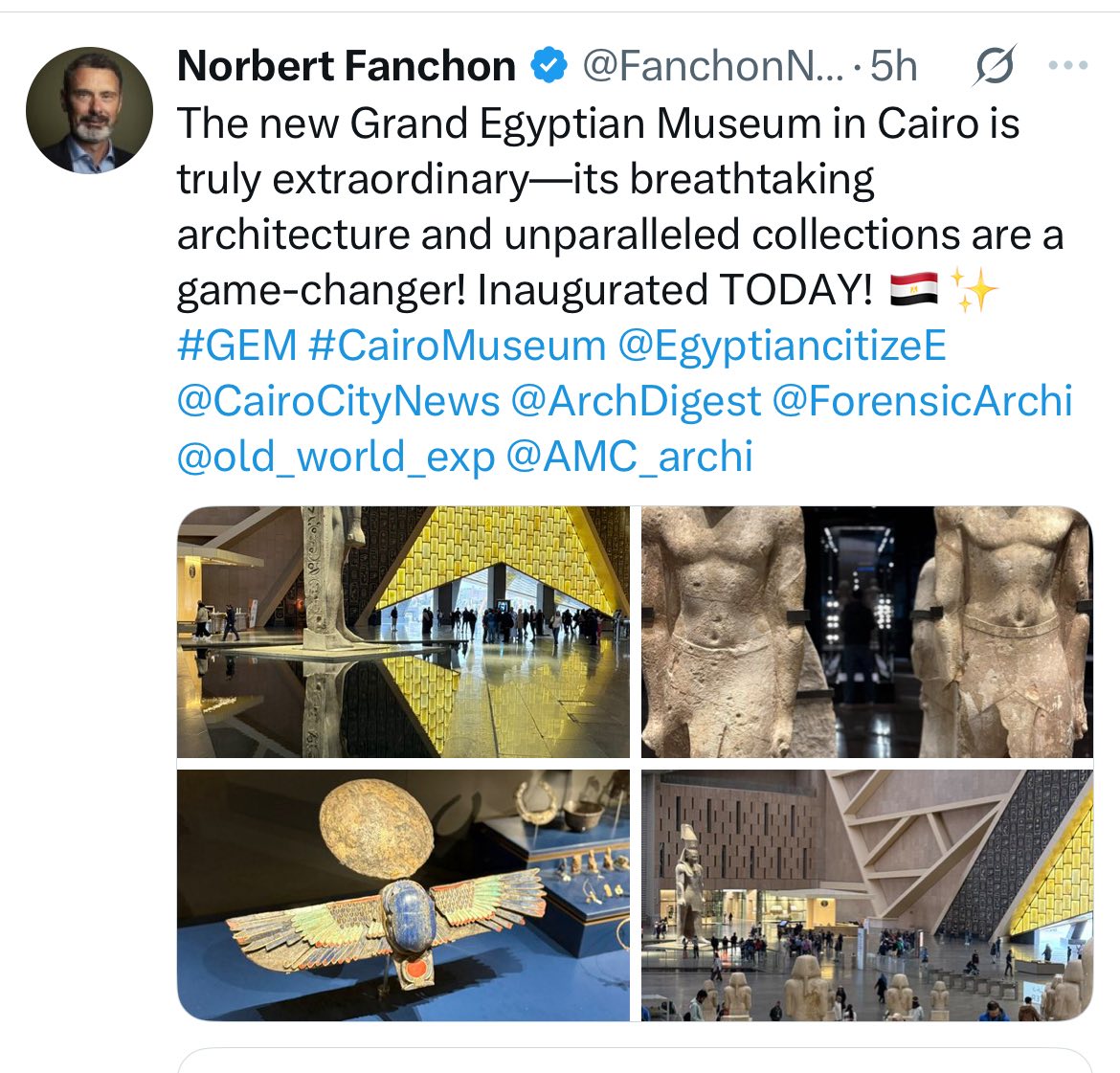 وعبر حسابه @FanchonNorbert، أعرب نوربرت فانشون، رئيس مجموعة جامباتا الفرنسية ومن بين أبرز الشخصيات الأوروبية اهتمامًا بالعمارة، عن إعجابه بالمشروع، مضيفًا: "إن المتحف المصري الكبير الجديد في القاهرة هو حقًا استثنائي—هندسته المعمارية تخطف الأنفاس... تم افتتاحه اليوم!".