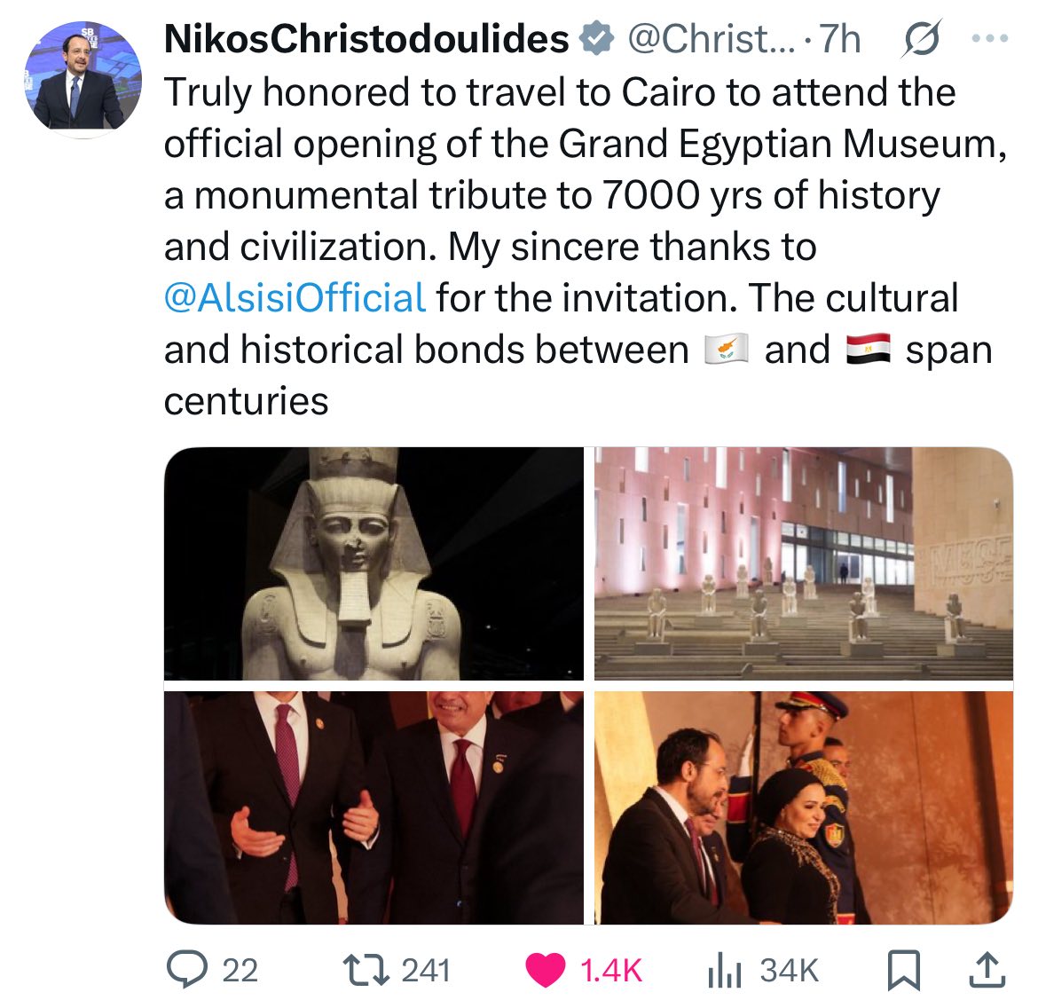 كما شارك الرئيس القبرصي، نيكوس خريستودوليدس عبر حسابه (@Christodoulides)، تعبيره عن سعادته بالحفل، فقال: "شرف حقيقي السفر إلى القاهرة... والروابط الثقافية والتاريخية بين بلادي ومصر"، مضيفًا: "إجلال ضخم لـ 7000 عام من التاريخ والحضارة".