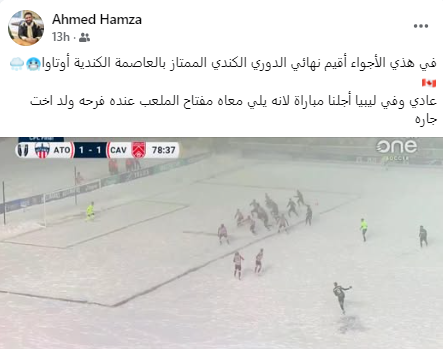 وكتب المصور الليبي تعليقًا على الصورة قائلًا: "في هذي الأجواء أقيم نهائي الدوري الكندي الممتاز بالعاصمة الكندية أوتاوا، عادي، وفي ليبيا أجلنا مباراة لأنه يلي معاه مفتاح الملعب عنده فرح ولد أخت جاره."