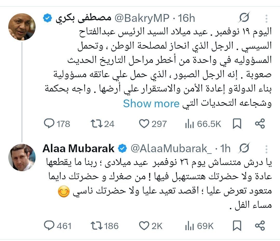 أثارت تدوينة نشرها علاء مبارك نجل الرئيس المصري الأسبق، محمد حسني مبارك ردا على تدوينة نشرها مصطفى بكري بمناسبة ذكرى ميلاد الرئيس المصري، عبدالفتاح السيسي، تفاعلا بين نشطاء على مواقع التواصل الاجتماعي.