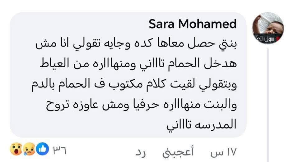 وكتبت ولية أمر، أن نجلتها، عندما دخلت الحمام خرجت تصرخ وتبكي لأنها شاهدت آثار دماء على مرآة الحمام، وسمعت صوت يهمس بكلام مخيف ـ على حد وصفهاـ.
