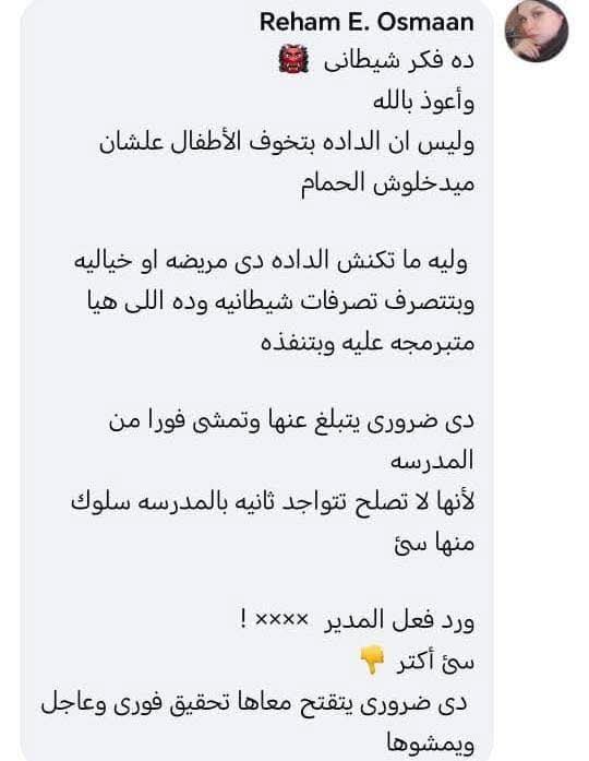 الأمر لم يقف عند هذا الحد، بل تكررت الشكاوي من أولياء أمور آخرين، حيث قالت ولية أمر، أنها وجدت كلمات مكتوبة على يد طفلتها ولا تعرف من كتبها، واتفقت معها ولية أمر آخرى، التي أكدت أن ابنها رأي ظل يجري في نفس الحمام.