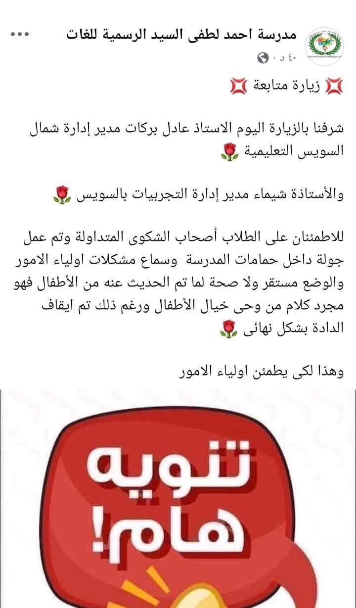 ومن جهتها، علقت إدارة مدرسة أحمد لطفي السيد بمحافظة السويس، على تلك الشكاوي عبر صفحتها بموقع التواصل الاجتماعي فيس بوك، بأنها تحقق في الشكاوي التي وصلتها، عن ما وصفته «كلام أطفال» وقررت وقف العاملة المسؤولة عن تنظيف الحمام بشكل نهائي وفحص الحمام.