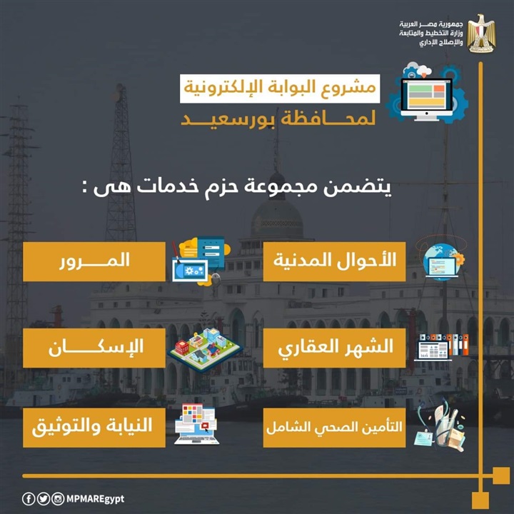 أوضحت وزارة التخطيط والمتابعة والإصلاح الإداري فى تقرير صادر عنها الجهود المبذولة وأعمال خطة مشروعات المنظومة الآلية الموحدة للتحول الرقمى بمحافظة بورسعيد، وذلك فى إطار تكليف رئيس الجمهورية بأن تكون بورسعيد أول محافظة رقمية ذكية في 30 يونيو 2019، وفى ضوء خطة الدولة للتحول الرقمي والسعي لتعميمه في جميع الجهات الحكومية والوزارات والهيئات التي تقدم خدمات حكومية، بهدف الحد من إهدار الوقت والحفاظ على أموال الدولة، ودعمًا لجهود تحقيق التنمية الشاملة.