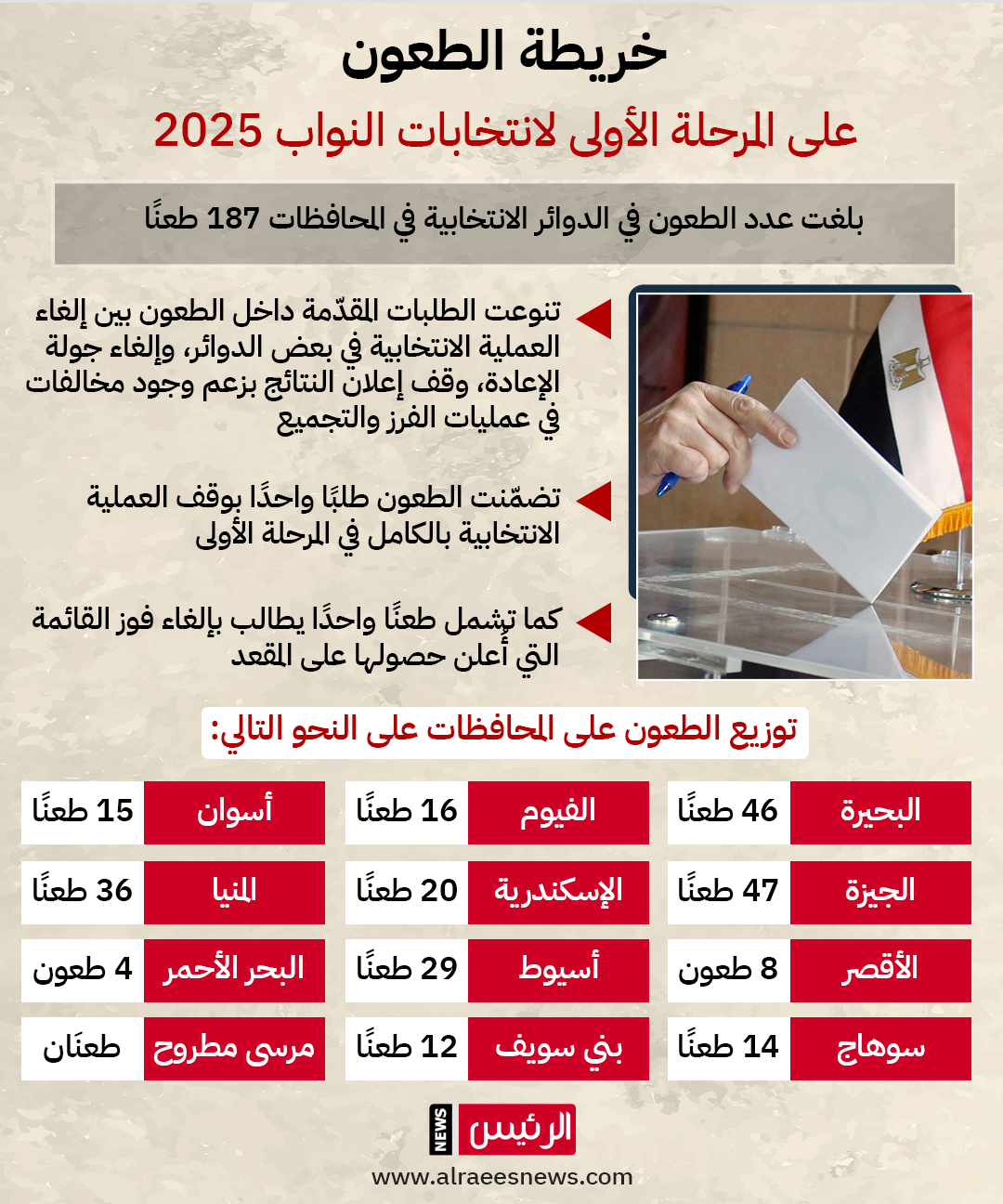 خريطة الطعون على المرحلة الأولى لانتخابات النواب 2025
