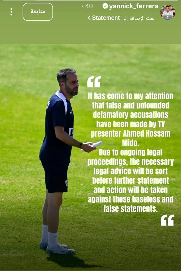 وكشف فيريرا عن هذا القرار عبر حسابه الشخصي على موقع التواصل الاجتماعي "إنستجرام"، حيث كتب مُعلنًا: "لقد وصل إلى علمي أن مقدم البرامج التلفزيونية أحمد حسام ميدو قد أدلى باتهامات باطلة وغير مستندة إلى أي أساس."