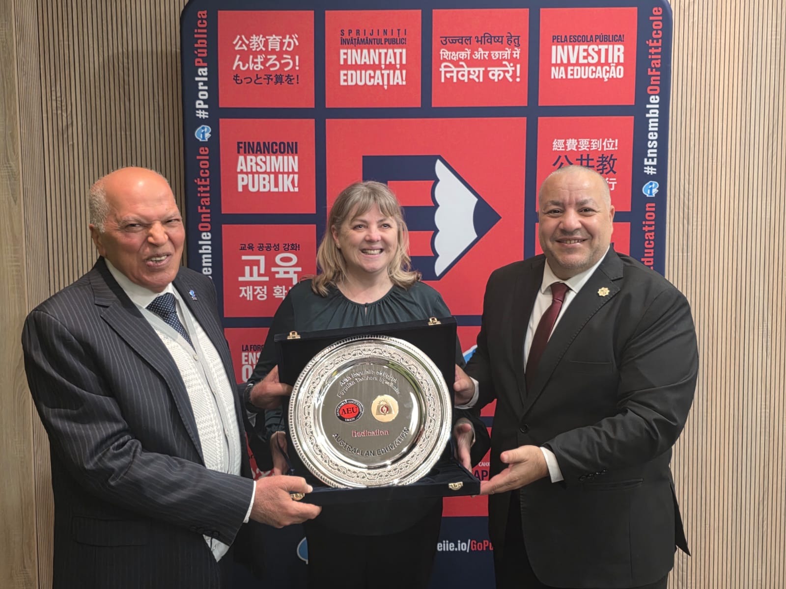 وفي ختام اللقاء، قام خلف الزناتي نقيب المعلمين المصريين بإهداء السيدة كورينا هايثورب رئيسة اتحاد المعلمين فى استراليا، درعًا تذكاريًا يحمل شعار نقابة المهن التعليمية، وقد أعربت السيدة كورينا عن سعادتها بهذا التكريم، مؤكدة أنه يمثل خطوة مهمة نحو بناء شراكات أكثر فاعلية داخل المنظمة الدولية للتربية.