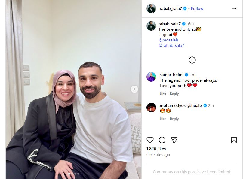 ونشرت رباب صلاح شقيقة محمد صلاح عبر حسابها على إنستجرام، صورة تجمعها بنجم ليفربول وعلقت عليها قائلة "الأسطورة الوحيدة"، في رسالة لدعم ومساندة شقيقها في أزمته الأخيرة.