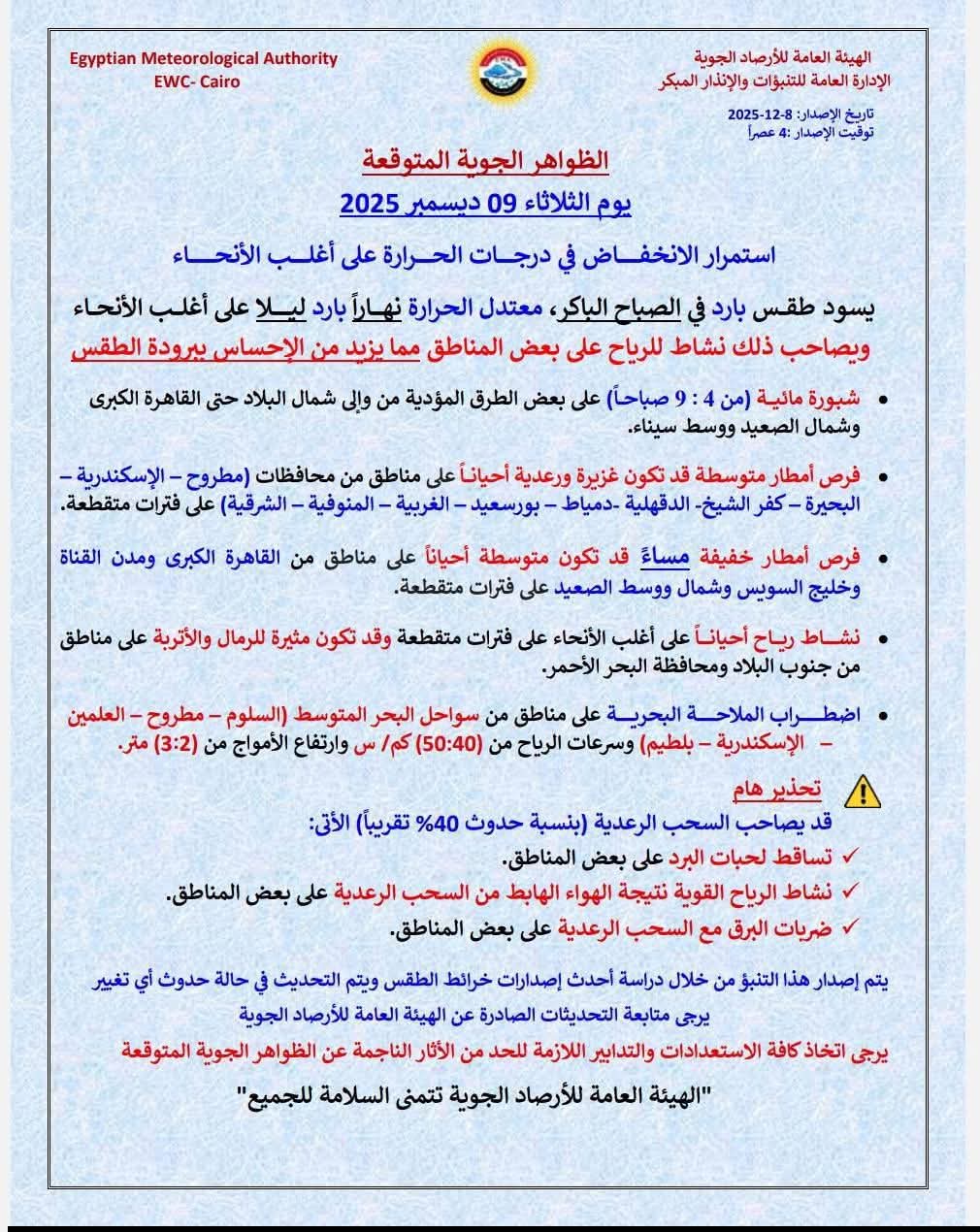 - فرص أمطار متوسطة قد تكون غزيرة ورعدية أحيانًا على مناطق من محافظات مطروح - الإسكندرية -البحيرة - كفر الشيخ - الدقهلية - دمياط - بورسعيد - الغربية - المنوفية - الشرقية على فترات متقطعة.