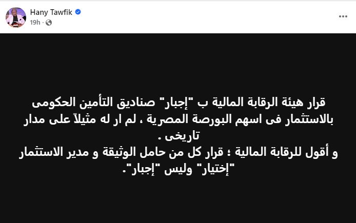 وقال في منشور على صفحته عبر “فيس بوك”: "القرار لم أر مثيل له وقرار كل من حامل الوثيقة ومدير الاستثمار اختيار وليس إجبار".