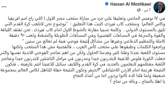 نشر حسن المستكاوي عبر حسابه على فيس بوك “في ١٧ نوفمبر الماضي وتعليقًا علي جزء من مباراة منتخب مصر الأول ( اللي راح أمم إفريقيا وكاس العالم) ومنتخب كاب فيردى كتبت هذا التعليق: "بوضوح نحن لا نلعب كرة القدم التي تليق بالمستوى الدولي، وكلمة نسبيًا مقارنة بالشوط الأول أمام كاب فيردي".