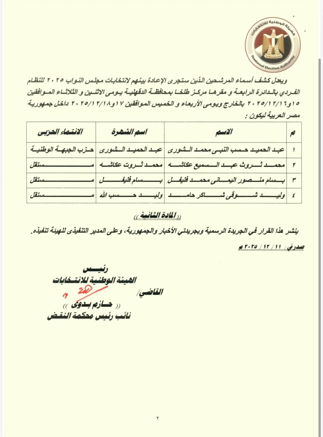 ونص القرار على تعديل كشف مرشحي الإعادة للنظام الفردي بالدائرة الرابعة (مركز طلخا) ليكون الترتيب النهائي كالتالي: