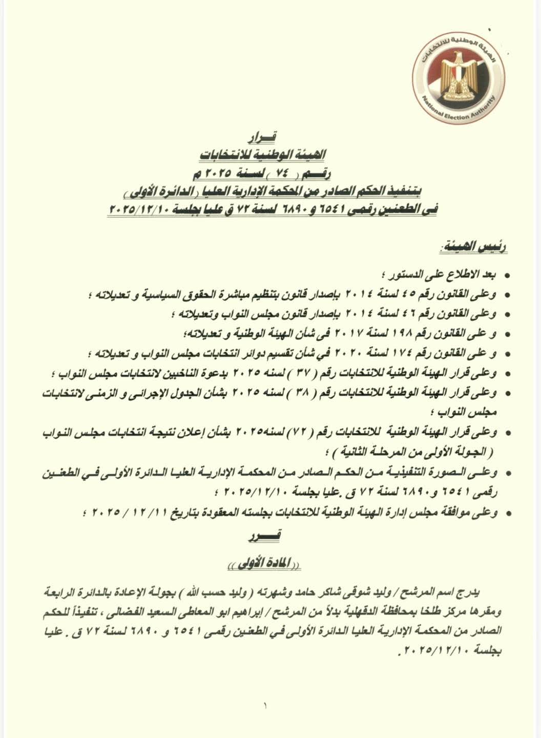 أصدرت الهيئة الوطنية للانتخابات القرار رقم 74 لسنة 2025، لتنفيذ الحكم الصادر من المحكمة الإدارية العليا، الدائرة الأولى، في الطعينين رقمي 6541 و6890 لسنة 72 قضائية عليا، خلال جلستها المنعقدة في 10 ديسمبر 2025، والمتعلق بتعديل نتيجة الجولة الأولى من المرحلة الثانية لانتخابات مجلس النواب بالدائرة الرابعة (طلخا–نبروه) بمحافظة الدقهلية.