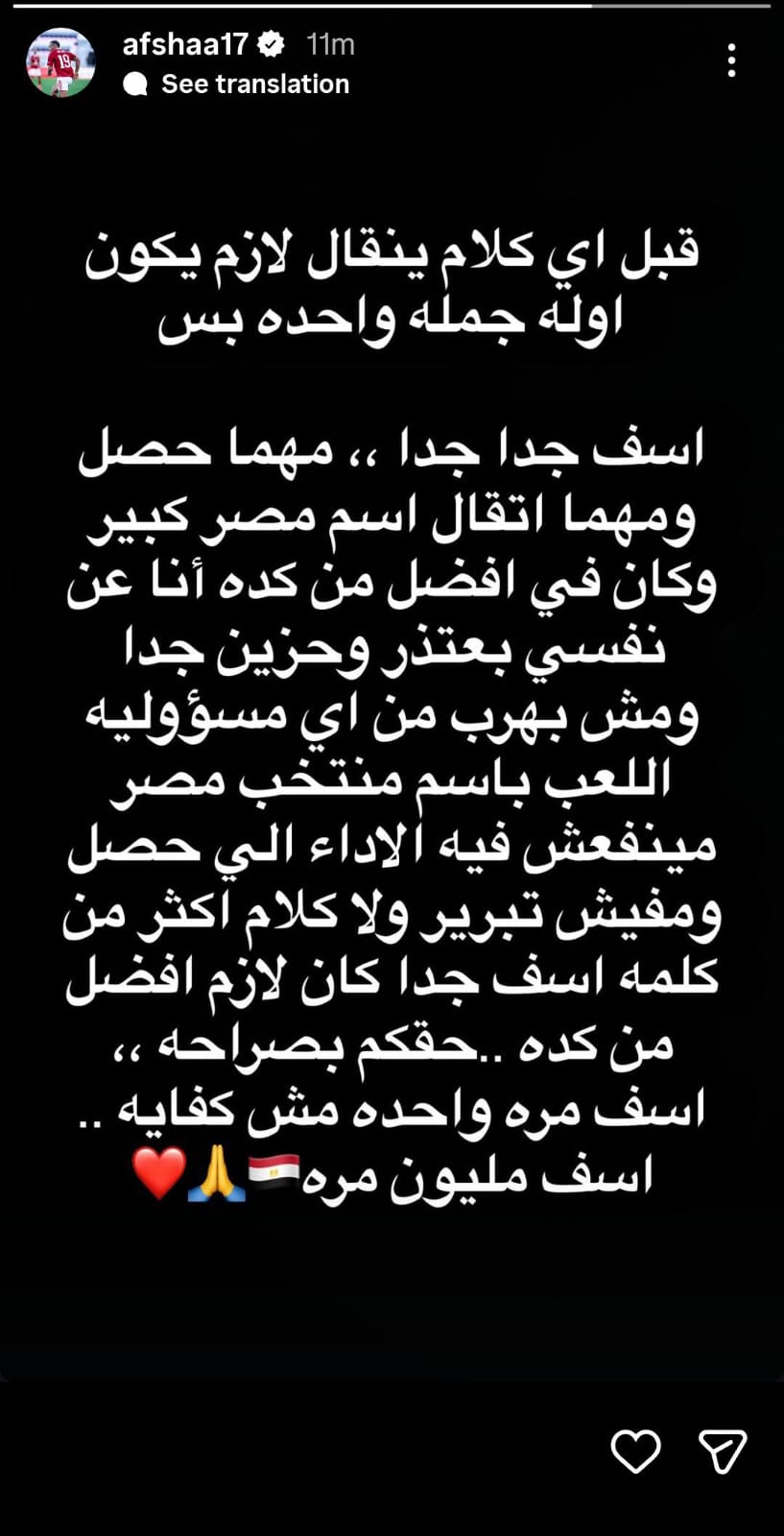 نشر أفشة ستوري عبر حسابه على إنستجرام قائلًا: " قبل أي كلام ينقال لازم يكون أوله جملة واحدة بس، أسف جدًا جدًا مهما حصل ومهما اتقال اسم مصر كبير وكان في أفضل من كده أنا نفسي بعتذر وحزين جدا ومش بهرب من أي مسؤولية".