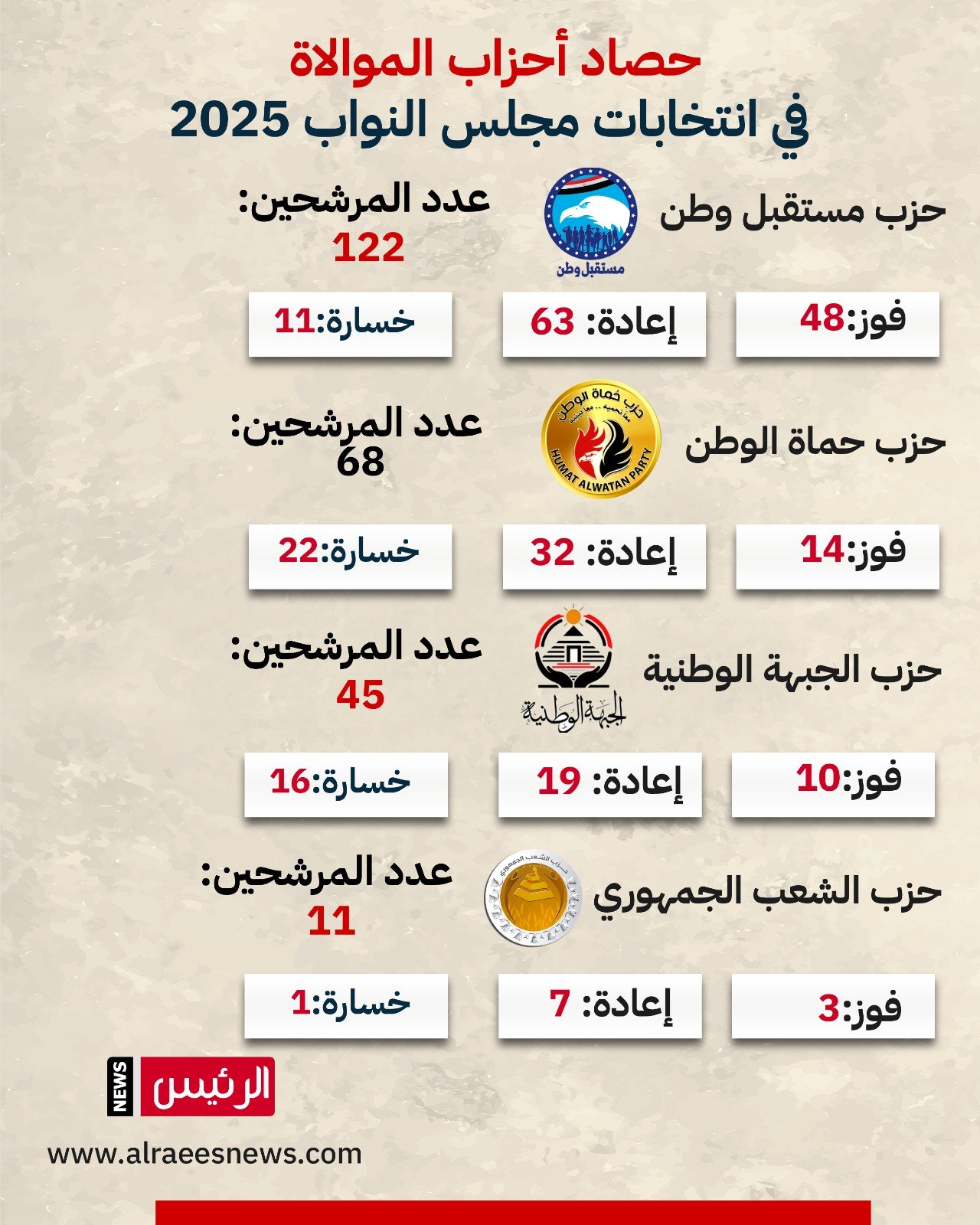وتصدّر المشهد حزب مستقبل وطن، الذي خاض الانتخابات على المقاعد الفردية بـ122 مرشحًا، نجح منهم 48 مرشحًا في حسم مقاعدهم من الجولة الأولى، بينما يتبقى للحزب 63 مرشحًا ينتظرون جولة الإعادة الحاسمة، في حين خسر 11 مرشحًا.