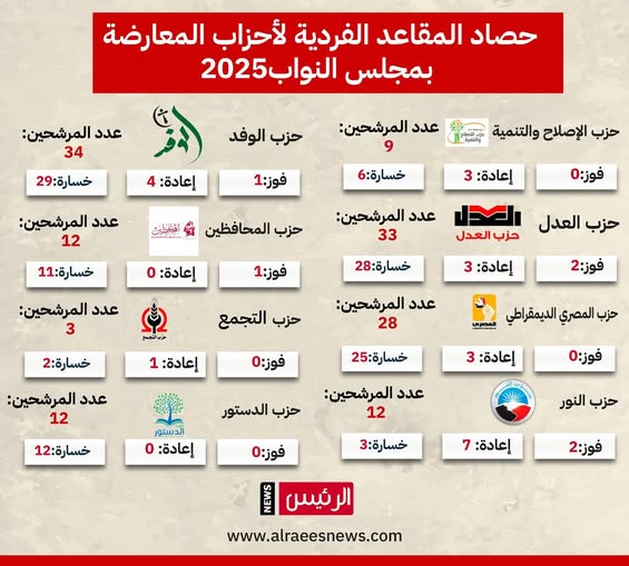 أما حزب الوفد، الذي دفع بـ34 مرشحًا، فقد فاز بمقعد واحد فقط في الجولة الأولى، بينما دخل 4 مرشحين جولة الإعادة، وخسر 29 مرشحًا.