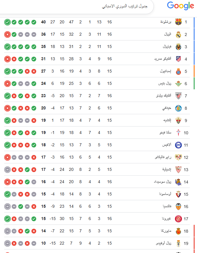 يحتل برشلونة صدارة الدوري الإسباني برصيد 40 نقطة